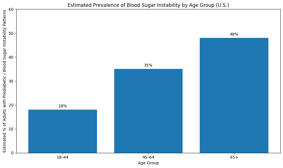 Estimated prevalence of blood sugar instability by age group in the United States. Source: 2025, CDC metabolic health and prediabetes prevalence reports.